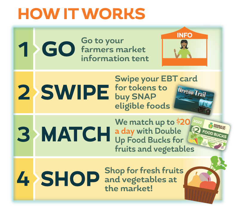 It’s easy with Double Up Food Bucks! For example, if you spend $20 of your SNAP dollars at our market, we will give you another $20 to buy more locally grown fruits and vegetables.